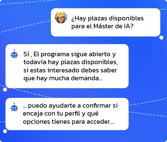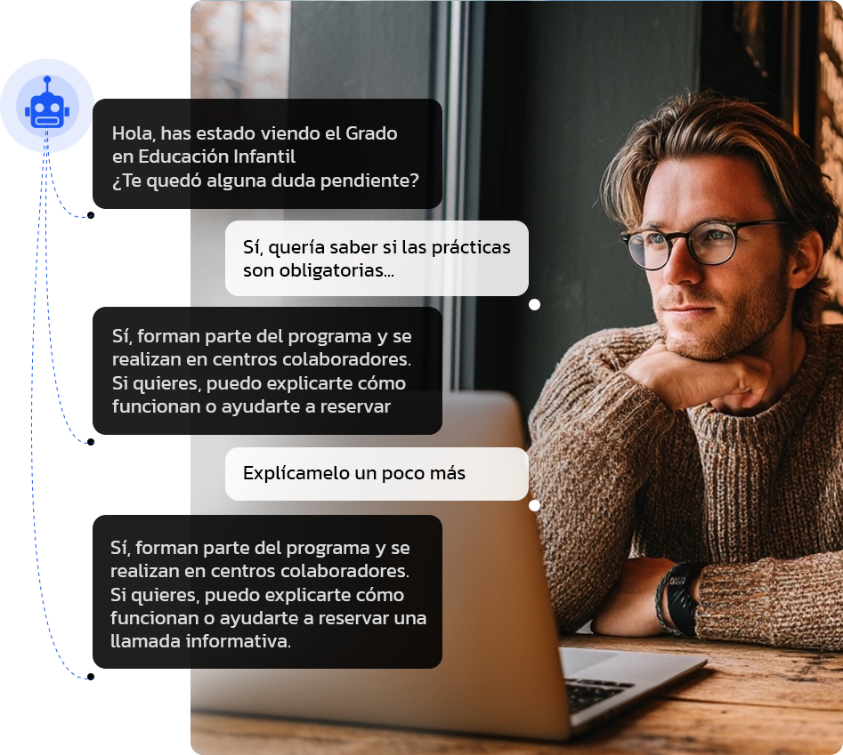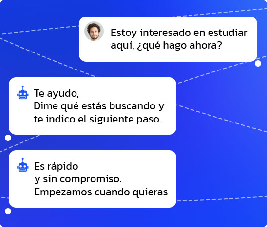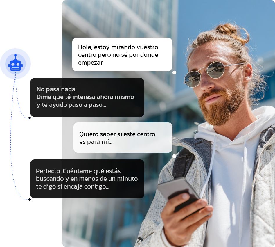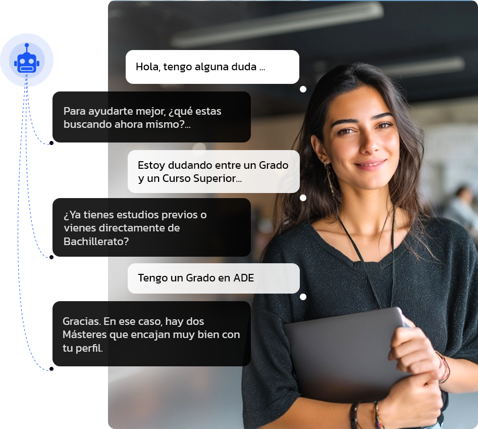 Un chatbot de IA permite a tu centro ofrecer una atención ágil y constante, mientras el alumno percibe una experiencia moderna, cercana y orientada a ayudarle a decidir con seguridad.