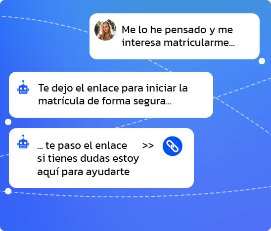 El chatbot acompaña al alumno, resuelve nuevas dudas y retoma la conversación cuando lo necesita, manteniendo vivo el contacto sin presión ni insistencia comercial.