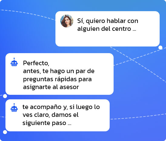 Sí. Cuando el alumno está preparado para avanzar, el chatbot recoge los datos necesarios de forma natural y los envía al agente humano adecuado, con contexto previo sobre su interés y perfil.