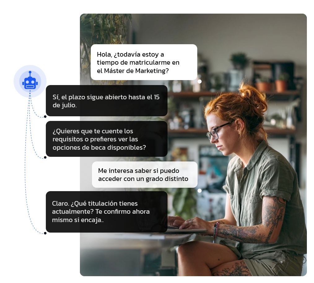 El chatbot atiende en el momento justo preguntas sobre programas, requisitos, precios, becas o plazos, evitando que la decisión se frene o que el alumno termine eligiendo otro centro.