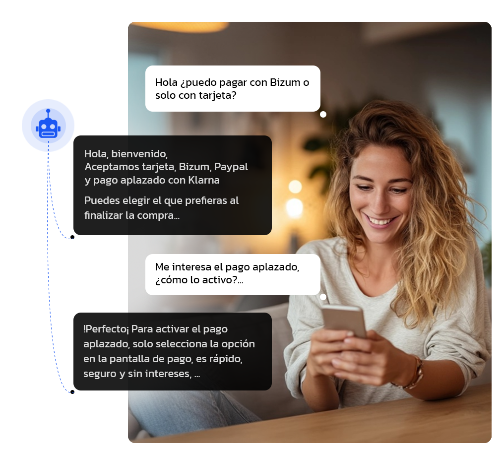 Ofrece a tus clientes una experiencia personalizada gracias a nuestro chatbot inteligente, una de las herramientas de IA más eficaces para ecommerce. Diseñado con tecnología conversacional, este asistente resuelve dudas al instante, acompaña al usuario durante la compra y mejora la atención postventa de forma automatizada.