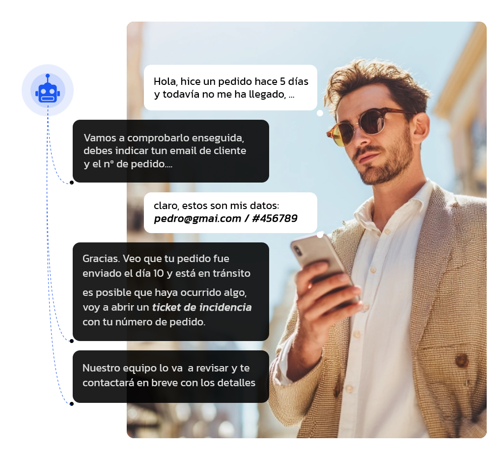 Puede escalar la conversación automáticamente a un agente humano o enviar un ticket al departamento adecuado.